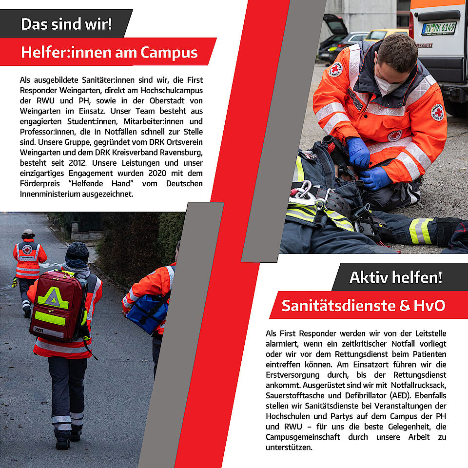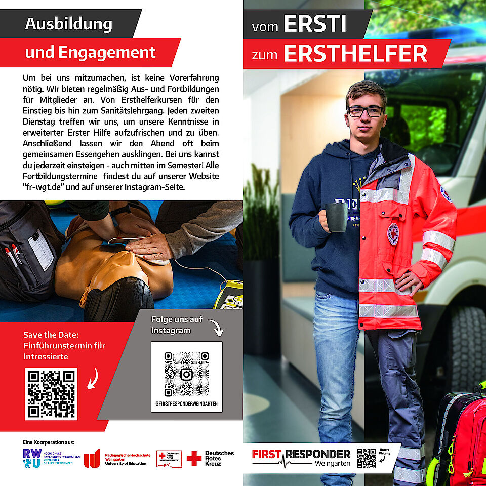 Die Hochschulgruppe „First Responder Weingarten“ ist ein engagiertes Team aus Studierenden, Mitarbeitenden und Lehrenden der RWU und PH. Seit 2012 leisten sie ehrenamtlich medizinische Erstversorgung auf dem Campus und in der Weingartener Oberstadt – unterstützt vom DRK-Ortsverein Weingarten und dem DRK-Kreisverband Ravensburg.