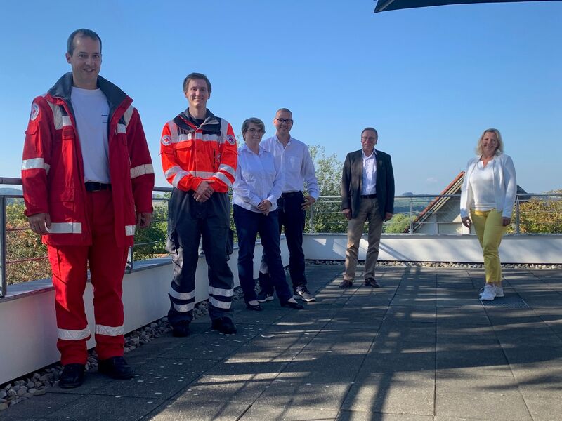 Bildunterschrift: v.l.n.r Markus Kaiser HvO Berg , Marko Hujer HvO Berg, Dieter Meschenmooser Präsident DRK KV Ravensburg, Tobias Schmid DRK OV Weingarten , Melanie Schmid DRK OV Weingarten, Manuela Hugger Bürgermeisterin Gemeinde Berg, es fehlt Katrin Kuschke