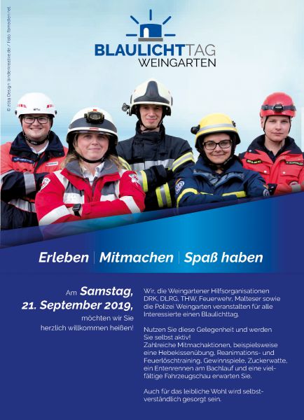 Wir, die Hilfsorganisationen DRK, DLRG, THW, Feuerwehr, Malteser sowie die Polizei Weingarten veranstalten für alle Interessierte einen Blaulichttag.